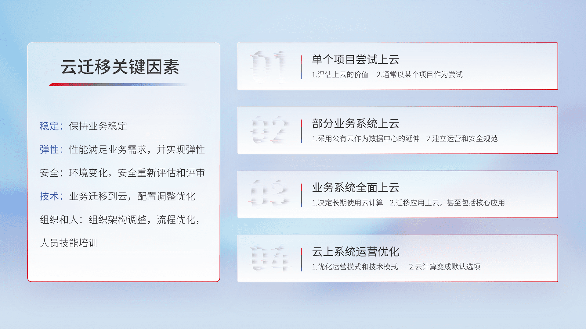 结合实际业务,,,,从规划设计、、、云平台选型、、云原生改造、、数据迁移、、、、集成交付,,迁移全过程为客户识别最佳上云路径,,,,做好风险识别管理,,设计网络架构、、、身份权限、、、安全审计合规、、操作审计、、、、日志审计、、、监控告警策略、、、、多站点容灾设计等,,,对云上基础设施进行整体规划,,,提升IT治理水平,,,以满足弹性、、、、高可用、、高性能的需求。。。