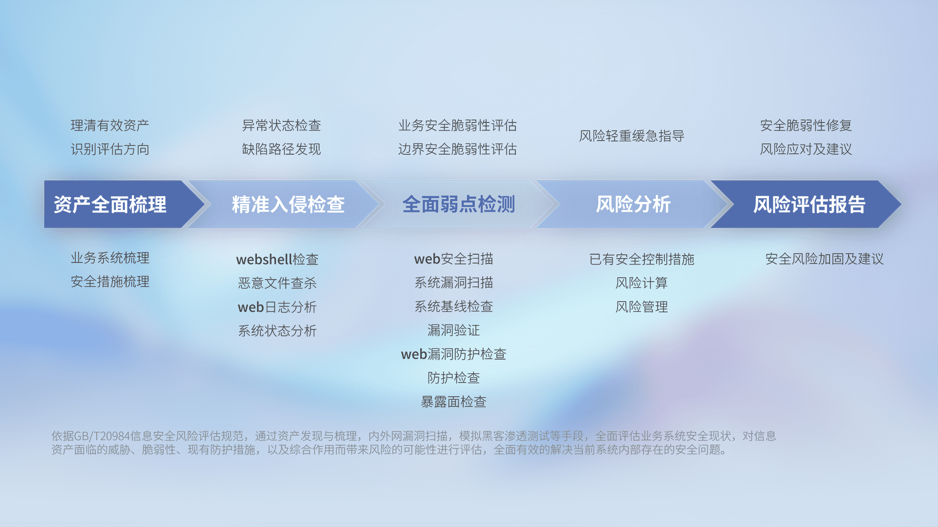 针对客户行业特性,,,,以专业的安全服务+多厂商联合解决方案提供专属的一站式安全管理服务,,,,帮助客户全面感知网络空间威胁,,,,基于识别、、、检测、、、、分析、、、、防护、、监测、、、响应的服务理论模型,,,,从方案咨询、、、、集成交付、、、评估验证、、、优化加固、、、、运维运营,,,,致力于为客户提供完整的闭环管理式安全服务。。以实战经验为客户打造高抵御风险的安全体系,,,帮助客户发现威胁、、、、对抗威胁、、、、处置威胁,,,不断积累安全对抗能力,,,持续保障数字化安全。。。